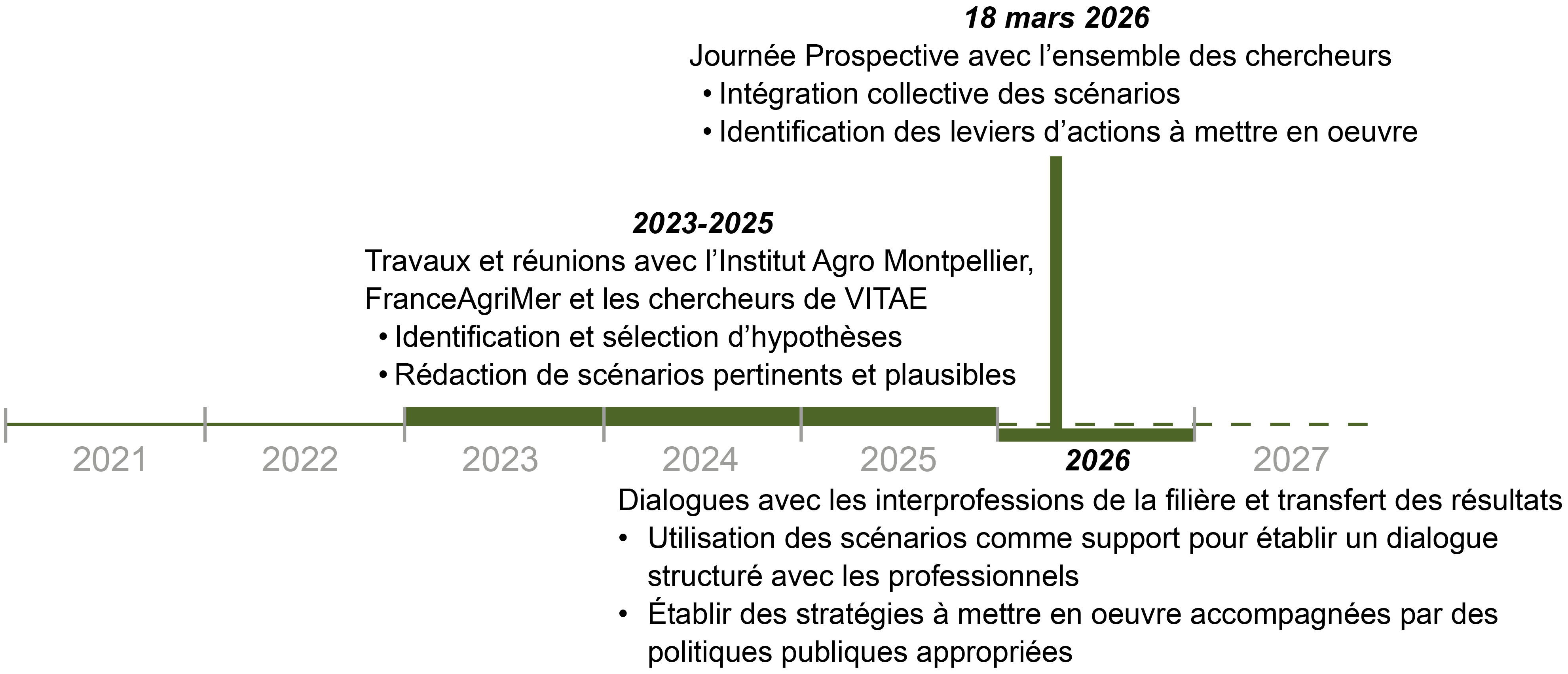 Outre les relations consolidées depuis 4 ans avec le Comité des professionnels de VITAE, un premier dialogue doit être engagé avec les interprofessions de la filière vigne-vin, représentants les Appellations d'Origine à l'automne 2025, pour être déployé dans les différents bassins de productions au cours de l'année 2026. Ici encore, il s'agira d'analyser ensemble les scénarios pour envisager les marges de manœuvre pour l'action et finalement les stratégies souhaitables à décider, mettre en œuvre et accompagner par des politiques publiques appropriées.
